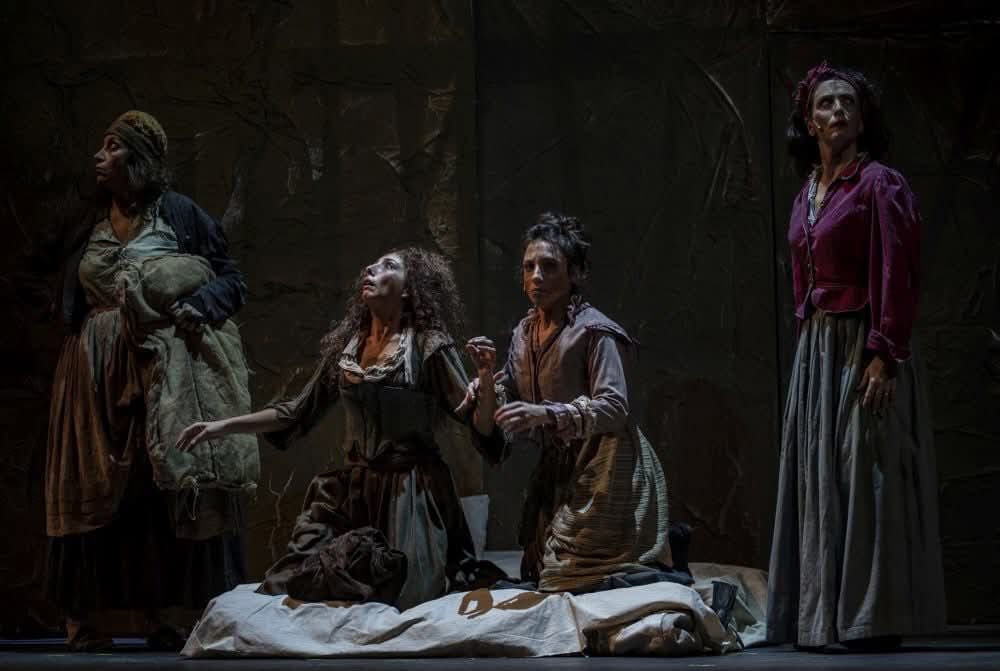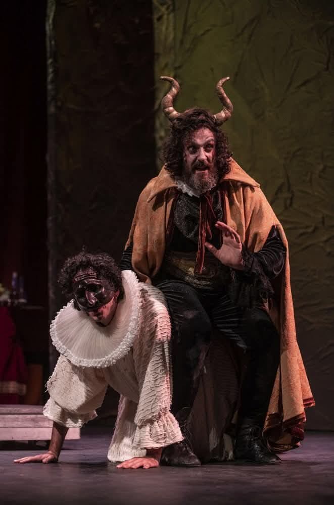 Un lavoro intenso che meriterebbe un saggio approfondito, uno studio su più piani, proprio come è stato concepito l’allestimento che miscela grottesco e immagin(e)azione. Al Teatro Trianon Viviani , teatro per eccellenza della Canzone napoletana, non potevano che emergere anche musiche d’eccezione: dal vivo e vivi, Mariano Bellopede al pianoforte, Arcangelo Michele Caso al violoncello, Carmine Marigliano ai fiati e Marco Fazzari alle percussioni, sono stati cerniera e varco tra i diversi piani pensati da Francesco Saponaro. È stato come un rito nuovo e antico, che ha adattato il testo ai linguaggi contemporanei senza alterare relazioni e senza mai rompere il diaframma palcoscenico-platea. Le sonorità, la forza delle visioni di Luca Saccoia che emerge da una botola nei panni di Parasacco, lo stregone protetto dal diavolo, sono drammaturgicamente incise dalle luci di Gianluca Sacco e nei suoni di Daniele Chessa.
