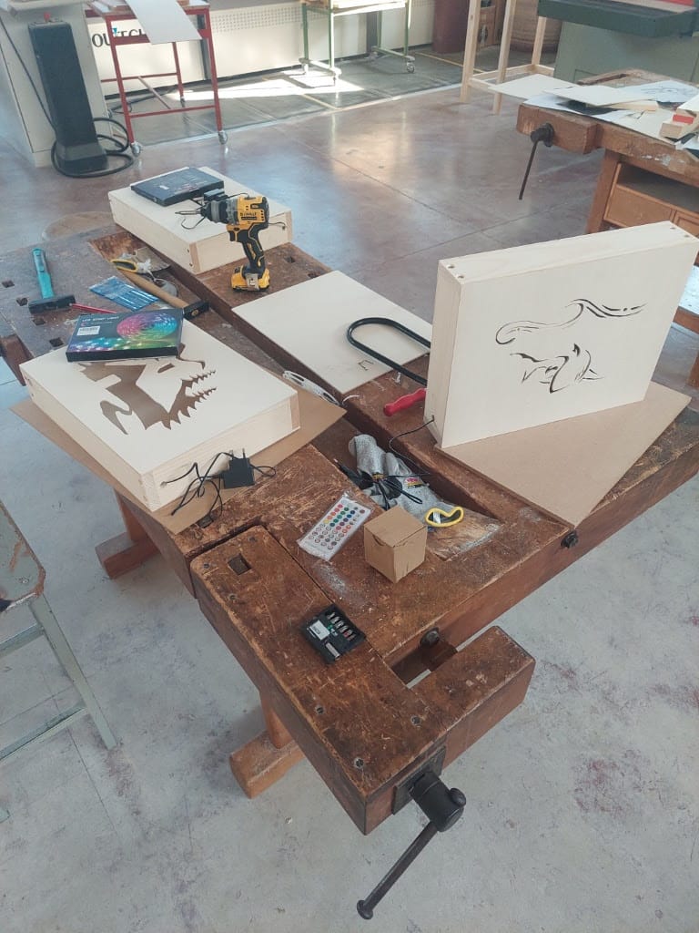 Nel corso della prima settimana, i ragazzi hanno progettato e costruito una lampada da scrivania a LED, personalizzata secondo un tema scelto individualmente. Hanno decorato un pannello di compensato con il traforo seguendo il tema scelto, montato poi su un telaio in legno di abete con una striscia LED interna. L'attività ha permesso loro di esprimere creatività e avvicinarsi all'artigianato.