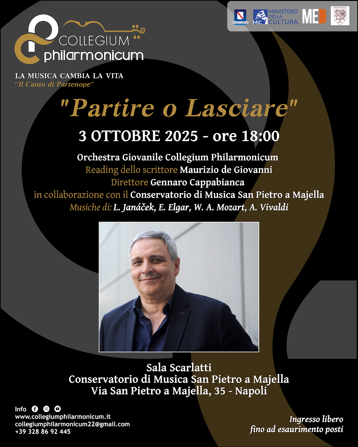 VENERDÌ 3 OTTOBRE 2025 alle ore 18.00, la prestigiosa Sala Scarlai del Conservatorio di Musica ‘San Pietro a Majella’ di Napoli ospita il reading dal titolo “Partire o lasciare”, che vedrà protagonista il popolare scrittore Maurizio de Giovanni, autore tra i più amati del panorama letterario contemporaneo.