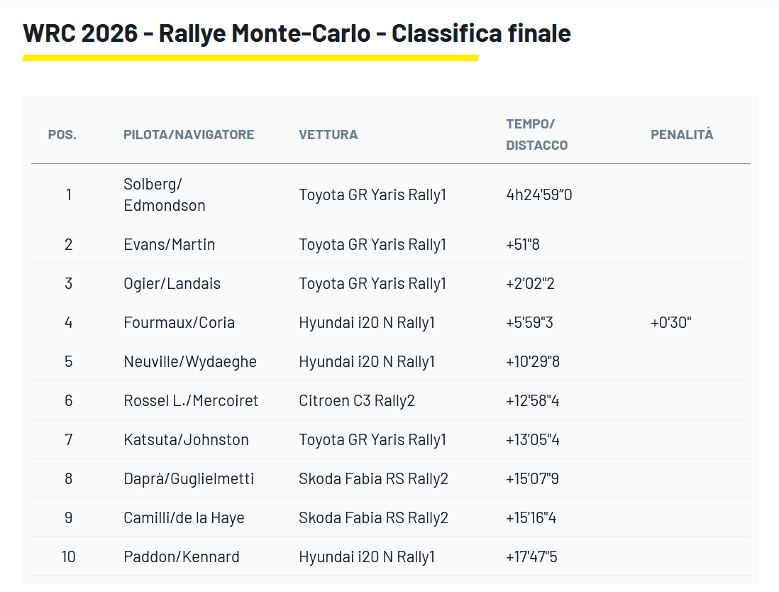 Si è così chiuso questo 94° Rallye Monte-Carlo dove la Toyota l'ha fatta da padrona, la Hyundai ha arrancato, facendo vedere però un po' di potenziale, mentre la Ford M-Sport continua a rimanere la cenerentola del WRC1, pur se con Jon Armstrong - fino a che è rimasto in gara (si è ritirato per incidente nella penultima PS) - qualcosa di buono si è visto.