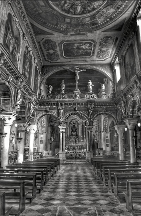 Va detto, tornando alla storia di San Nicolò, che della struttura abbiamo testimonianze nelle fonti veneziane, da cui sappiamo che la chiesa romanica fu ricostruita nel XIII secolo, adottando un impianto basilicale a tre navate con portico antistante. Questa disposizione interna venne poi ripensata alla fine del Cinquecento, quando venne completamente rinnovata forse anche su forte stimolo della Visita Apostolica del 1581. La chiesa assume dunque in questi anni l'aspetto che più la contraddistingue ancora oggi, derivante dall'aggiunta di un apparato ligneo nella navata centrale, che va a creare un vero e proprio recinto ornato di un sfarzoso apparato di statue lignee. Tali decorazioni comunicano con un vasto ciclo cristologico alle pareti, culminante nel soffitto con dipinti celebranti il santo titolare.